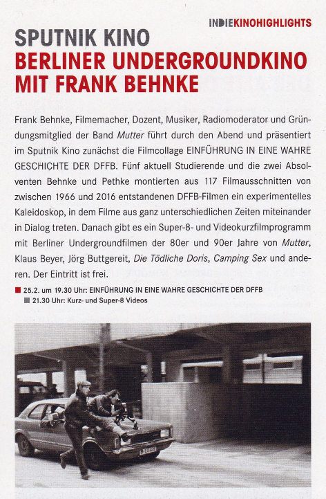 Und die Geschichte wäre: Stefan Pethke und ich ließen uns Zeit, das Kalenderjahr 2018 für Festivalanmeldungen unseres Filmes EINFÜHRUNG IN EINE WAHRE GESCHICHTE DER DFFB zu nutzen. Wir meldeten uns auch treu an, per Mail, per Papierpost, telefonierten, um der ungewöhnlichen Struktur des neuen Films mit altem Material noch etwas Substanz zu geben – nein, die hat der Film ja, eher um den Festivalmachern Mut zu machen.